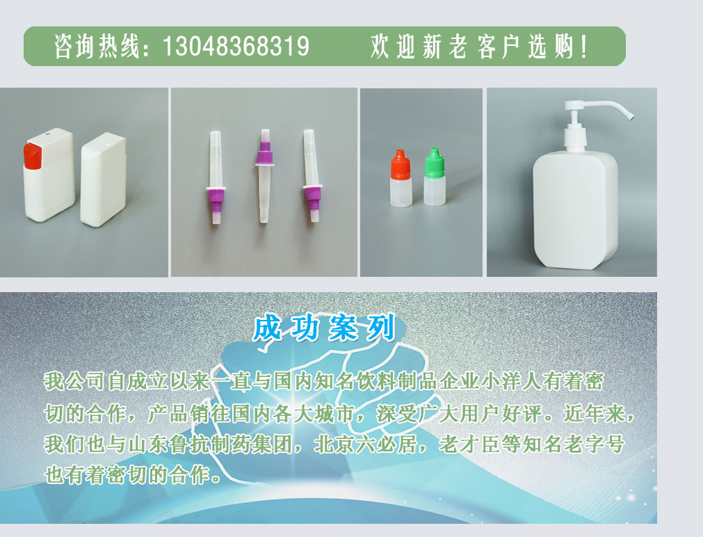 我公司主營(yíng)各種塑料制品。主要產(chǎn)品有:各種飲料瓶、食品罐;以及醫(yī)藥用瓶,包括:巴氏滴管;試劑檢測(cè)瓶;眼藥水瓶;消毒液瓶;量杯等。